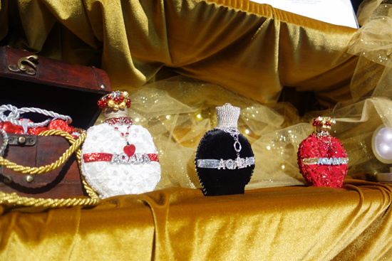 白と言えばウエディングですが、白のドレスは3日目なのだそう。フレンチレースにキラキラ光るブロケードやパールをあしらい、ボトルキャップにはゴールドとレッドの王冠を、そして天然の麻がキャップに巻かれています。麻は昔、ウエディングリングと交換するために使用されていたのだそう。指輪をはめるまでは指に麻を巻いていたんですね。