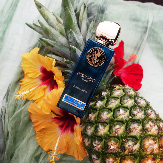 香りはもちろんマリンなのですが、マリンでありつつも最初のムエットの印象ではトロピカルなフルーツが印象的でした。それはジャックフルーツを思わせるビターなフルーティーノートでしたが、肌ではブラックカラントが印象的に弾けてスタートです。あれ? マリンは? とマリンノートを探してしまうほどトロピカルフルーツが強めな香りで、フローラルノートも主役ではなくフルーツの余韻をけん引する、花束で言えば隙間を埋めるカスミソウのような役目。だからか、全体のトーンとしてはマリンリゾートで楽しむトロピカルカクテルです。これは暑い夏にこそ楽しみたい、気分をあげていくトロピカル。ピーチやベリー系ではなく、ブラックカラントとパイナップルなので、少し大人なテイストで、ジュースというよりカクテルを思わせます。時間が経った残り香の中にツリーモスが感じられるのもポイントで、ラストまで微かなウッディムスクに重なってフルーツがいきいきと香りつづけます。