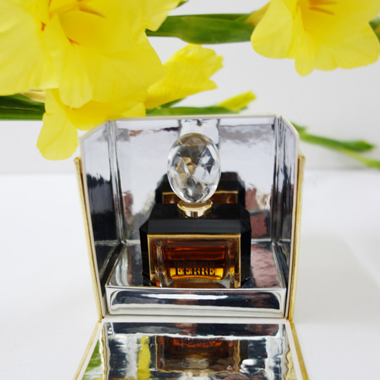 以下はパルファムのレヴューとなります。EdTもフラコンタイプがあり、そのフラコンなどにはシャンデリアに使われるようなクリスタルチャームが付いているのですが、パルファムはその部分がキャップとなっています。ボックスは鏡面仕様になっており、いろいろな角度からボトルが映り込んで美しく見えるようになっています。