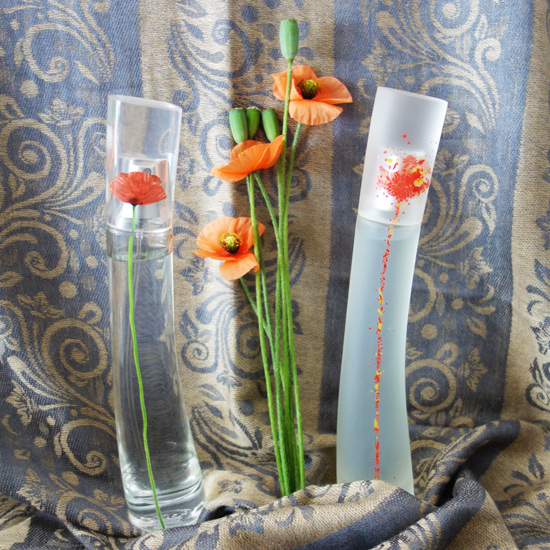 「 都会に咲く一輪の花。モチーフに選ばれたポピーは、アスファルトにも根づくことのできる流浪の花です。フランスでは、日本でいうタンポポのような存在です。そのひそやかに、でも、凛と咲く姿は、慌しい街をやさしく彩り、ふと、やわらかな気持ちにしてくれます。FLOWERBYKENZOは、都会を生きる女性に、そのポピーの姿をなぞらえて、うまれました。硬いガラスは、空高くそびえたつ高層ビルにインスピレーションを得た”街”の象徴。そこに、一輪のポピーが描かれます。その世界観を大切にデザインされたボトルの表面には、どこにも商品名はかかれることなく、それは、ポピーの茎の裏に、ひっそりと記されています。」