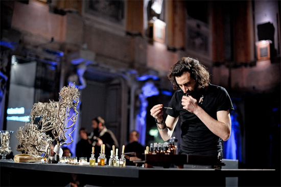 イタリアはパルマに近いサルソマッジョーレ・テルメ(Salsomaggiore Terme)のパフューマリーです。Giuseppe Imprezzabileによるプロジェクトという感じのブランドなのですが、ご本人の本名よりもMeo Fusciuniとしての方が有名ですので、アーティストネームみたいな感じです。彼はパルマ大学でハーブを学んだ化学者で、卒業後はモロッコ、トルコ、中東など各地を旅しながら植物、特にハーブとスパイスの知識を高めたそうです。調香師と呼ばれるよりもAromatario(ハーブやスパイスを扱う昔の香料売りのこと)と呼んでほしいと言っていますが、特別に調香スクールで学んだわけではなく全てが独学で、彼はいわゆる名香の模倣は出来ません。どちらかというとアーティスト的な感覚の方で、香水を手がける前はイベントで空間演出をしていたんですよね。