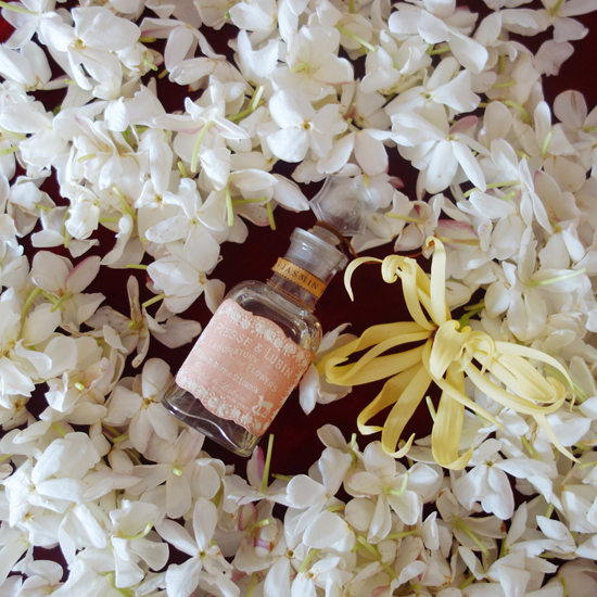 発売年もわからないのですが、Kiss Me Quickのことを考えるとやはり1900年以前の品なのでしょうか。だとしたら、110年を経ても全く変わることのないジャスミンアブソリュート(Jasminum officinale abs)の香りです。これは当時好まれていたシングルフローラルの香りなのでしょう。ジャスミン以外の香りがわかりません。もう、本当に純粋にジャスミンのアブソリュートが美しく香っていて驚かされるばかりなのですが、持続はとても短くて30分が精一杯・・・というところを見ると濃度はEdC並みなのですが、消え入る頃にアニマリックな香りがしてくるので、本当にアニマルムスクを使用しているのでしょう・・・。「臭い」というほどではありませんが、ジャスミンとは相性が良いんですよね、ムスク。この当時はまだジャスミンに関する合成香料は生まれていないと思うのですが、雑味が少なくすっきりとしたアブソリュートであることにも驚かされます。