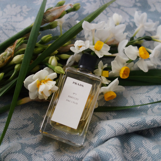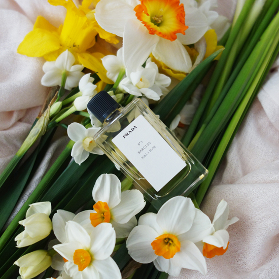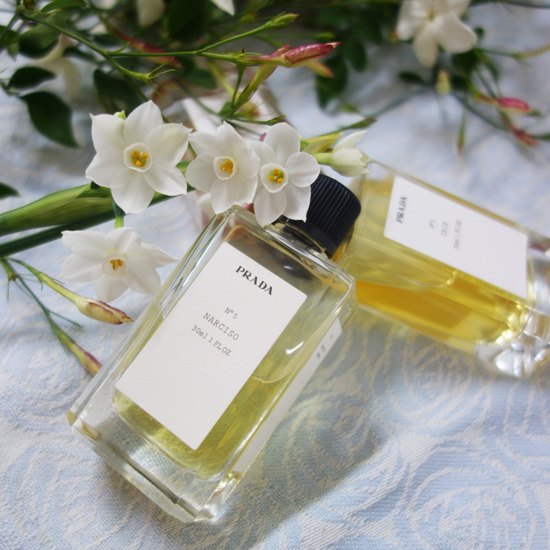水仙をテーマとした香水というのは決して多くはありません。精油は生花と香りが違っているというのも理由の1つだと思いますが、基本的に再現するとあまり良い香りにはなりにくい、というのも理由の1つなのかもしれません。水仙の香りを特徴付けるクレゾール香というのは量がとても難しく悪臭に感じてしまいがちです。でも、この香りが全くないと水仙にはならないのです。ジャスミンで言うところのインドールみたいなものですね。このプラダのパルファムはナルシスの精油を使わず、クレゾール香あまり使わずに再現された香りです。印象としてはトップノートは水仙というよりもオレンジブロッサムの香りになってしまっているのですが、水仙だと思わなければとても素敵な香りです。じーっと香っていると確かにこういう系統の水仙の香りもあったかもしれない、という錯覚を覚える香りで、瑞々しくすっきりとしているのが特徴です。フルールドランジュの方はベースのアイリスが出ていてパウダリーな化粧品香になっていますので、ある意味こちらの方がすっきりとしたオレンジブロッサムだと感じる方もいらっしゃるかもしれません。基本的に香りはあまり大きく変化しないまま薄れていきますが、ミドル以降はオレンジブロッサム→水仙っぽく変化していきますのでオレンジブロッサムと水仙の中間値のような香りです。