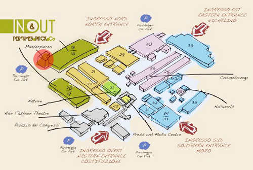 今年も4/10〜14にイタリアはボローニャにて開催されましたCOSMOPROF2008ですが、香水はIn & Outとして4/10〜13に開催され、4/10が関係者日となっていましたので、僕は10日の朝一から駆けつけました。下記にあるような巨大な会場内の中で、In & Outは緑の部分でしかなく、更に4/10に開放されいたのはパビリオン16〜20とMasterpeaces(傑作)のコーナーだけなのです。Masterpeacesはこの会場内の赤く○をした箇所にあるのですが、逆にそれだけ小さなところに集中しているわけです。新宿伊勢丹本館階の化粧品売り場全てがニッキアフレグランスの展示コーナーになっているとお考えいただければ雰囲気は伝わるかと思います。冷やかしの閲覧、輸入目的ではない業者の閲覧を排除し、スムーズに商談を進めるため、また他の香水と一線を画すため、価値を理解している輸入業者だけに招待状をお送りしてブースを開放するという徹底振りです。冷やかしで入っても気軽に試せる雰囲気ではありませんし、必ず商談かと聞かれますので、冷やかしで入っても辛いだけなのですが・・・。