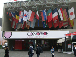 COSMOPROFの正面玄関は各国の旗が掲げられています