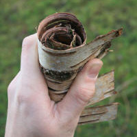 まずは缶を用意します。 その缶の下には穴を開けておきます。 白樺の木の皮を丸めて・・・