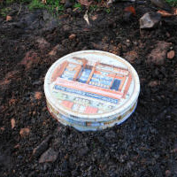 たくさん丸めて紐でくくります。 まるめた樹皮を缶の中に詰めます。 蓋のない缶を穴を掘って埋めます。