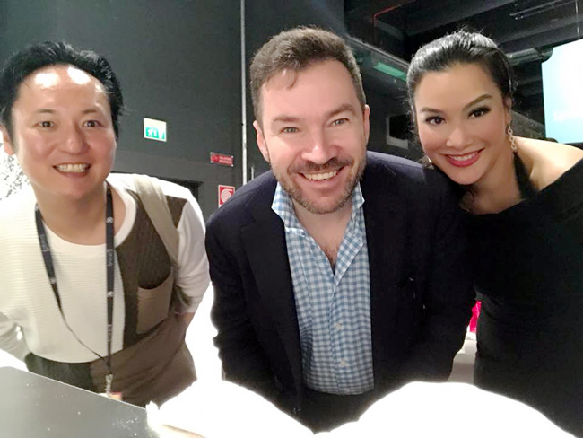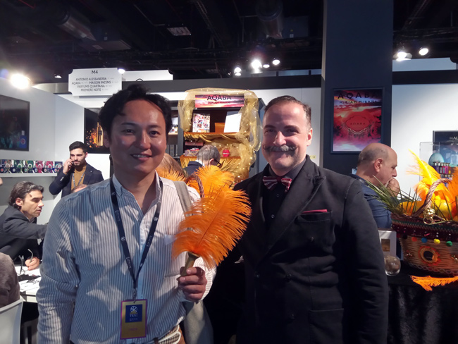 彼女のブースはいつも賑やかで忙しく、誰とどんな話わしたのか記憶にないのではないかと思うほど。そんな中で友人たちとの撮影はちょっと気を抜いたひと時となるのです。フレグランティカロシアのセルゲイと共に。