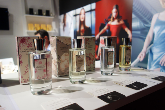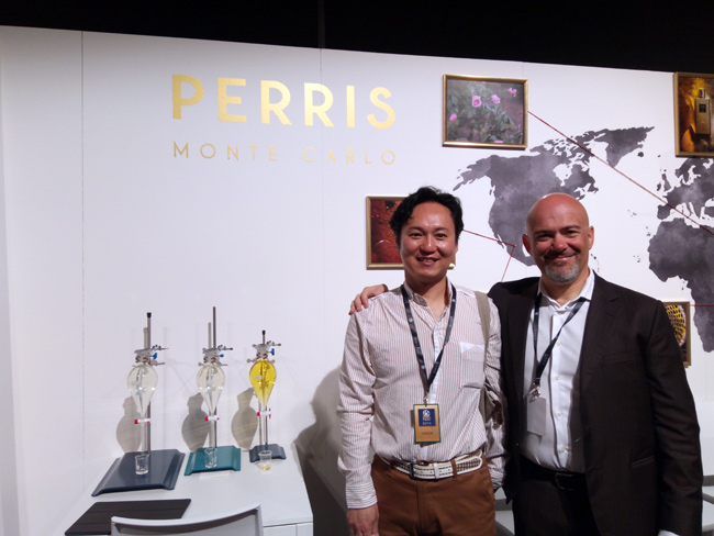 気づいたら、どっぷりと彼の人柄の魅力にはまっていたというのがHoubigantPerris Monte Carlo。今度の新作はイタリア、シチリアのシトラスを使うんだよ、とベルガモット、チェードロ、タンジェリンなどの精油を用意していました。新作は未公開でも、こうした素材で楽しめるブースはいいよなぁ。大好きだと常々公言していたら、オスマンサスのパルファムセット(トラベルスプレー)を頂いてしまいました。僕がいつも旅行していることを知っているから。なんと嬉しいサプライズなんだか。