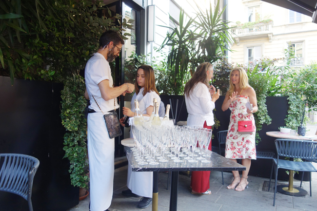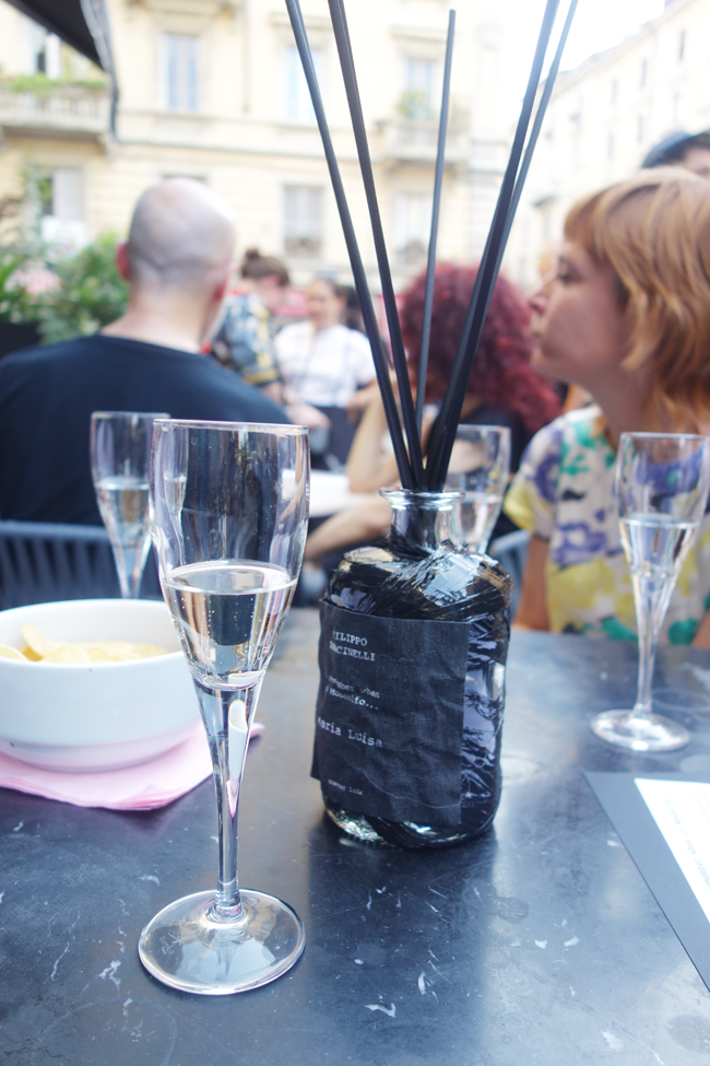 一応、これもプロモーションの一環なんですよね。彼らはミラノ在住の助っ人と、24日にオープンしたヴァチカンの近くのフラッグシップストアのオープニングに向けてローマに移動するスタッフと、彼と共に地元のモンドルフォに戻るチームに分かれて解散するそう。声を枯らして頑張ったスタッフたちにお別れをして、友人たちともう2杯のカクテルを楽しむ。