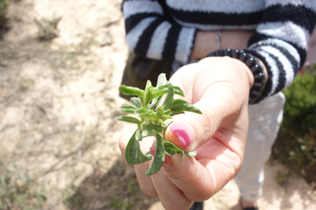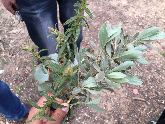 Edineが見せてくれたのは、2種類のラブダナム(ロックローズ)でした。細い葉のものは一般的に良く見かけるタイプのものです。園芸種には葉の広いタイプのものもあり、花も白ではなくピンクやミックスがあったりするのですが、このような葉先が少し丸いタイプのラブダナムを見たのは初めてです。しかも、園芸種ではないのですから。Halimium halimifoliumという名前で、なんとそっくりな黄色の花が咲くのです。黄色のラブダナムの花なんて見たことないよ。Halimium halimifoliumからは香料の採取を行っていないそうですが、今後行う予定とのこと。今まで体験したことのないラブダナムがここには存在するわけです。テンションが上がる!!