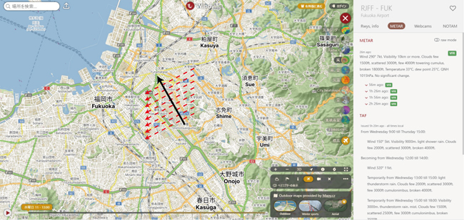 ところが、福岡空港は飛び立つ向きに対して完全な横風でした。横風の場合、15メートルくらいで欠航の判断がなされ、25メートルは完全にアウトとなります。12〜15が微妙と判断される中、当日の予報は15メートルそのものだったのでした。(Windyでは空港の情報も知ることが出来ます)
