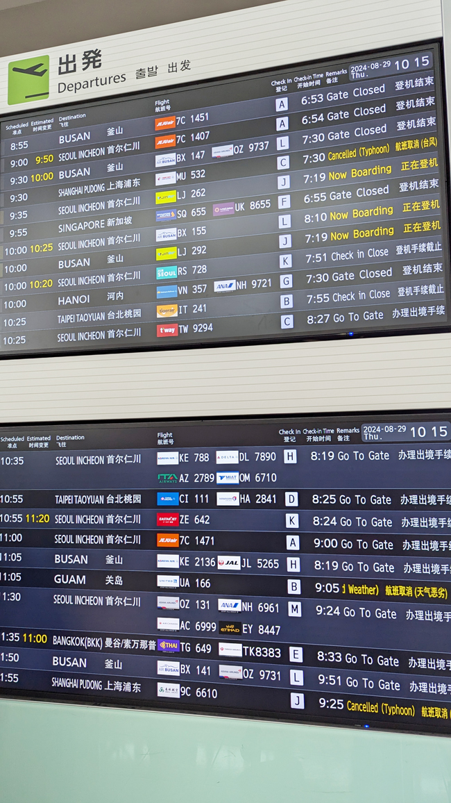後日談としては、20:40発のOZ 135便はもちろんのこと、翌30日のフライトも全てが欠航になったそうです。ギリギリのギリギリで前便に振り替えるという離れ業を決めて事なきを得たわけですが、通常15:00便であれば空港に行くのは13:00頃なわけで、8:37に欠航アナウンスを自宅で知ったならば、誰もが諦めてしまうことでしょう。でも、11:30の便に望みをかけて朝一から空港で待機していたことで、ほぼ満席だったOZ 131便に滑り込めたのですから、考えに考えた粘り勝ち、絶望から奇跡の大逆転だった気がします。