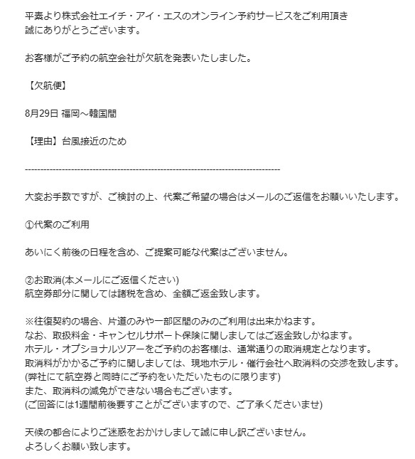 HISからの電話を待っている間に、遂に15:00の僕の予定していた便が欠航となった旨、メールで届きました。メールには払い戻ししか対応が取れないとの記載があります。つまり、振替便がない、と。