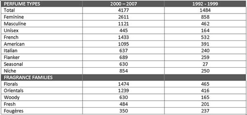 1992年〜1999年までに発売された香水は1,484個なのに対し、2000年〜2007年では4,177個なのだそうです。世界的に香水のブームが押し寄せていることは明らかですよね。同じ年代で、ニッキアフレグランスに限って数えると、1992年〜1999年までが250個だったのに対し、2000年〜2007年では854個となっています。なんと発売された香水のうち2割がニッキアフレグランスなんですよ。これも本格的な香水市場の増加を顕著に表していますよね。また、下の表を見るとそれぞれほぼ3倍の数となっていますが、Seasonal(季節限定品)が20倍に増加しているのがわかります。そう言えばどのブランドもサマーバージョンを発売していますよね、ここ数年。種類としてはウッディフレグランスが増加しているのが傾向でしょうか。今年はどんな香りが発売されていくのか、楽しみです。ちなみにこの書籍はこちらで購入が可能です。とくに難しいことはありません。Fragrances of the World 2008の他に、Perfume Legendsの英語バージョンと仏語バージョンも購入出来ます。Order Unitに冊数を入れると、自動的に隣のPostage &Handing(送料)が計算されます。USドルだと170ドル(送料込み190ドル)ですが、AUドルだと180ドル(送料込み195ドル)なんです。細かい話ですが、USドルは110円ですが、AUドルは97円くらいなので、AUドルの方が少し安いかも。って、僕は昨年AUドルで購入しました。注文から到着まで結構時間がかかりましたが(2、3週間)特別問題はなかったですよ。(2万円の書籍なので購入される方はあまりいらっしゃらないかと思いますが、ご興味のある方はどうぞ〜)