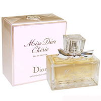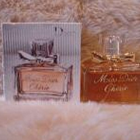 ではこちらはいかがでしょうか。DiorのMiss Dior Cherieです。右側が正規品で、左が偽造品なのですが、液体の色もかなり濃くて違いが歴然にも思えます。でも正規品のパッケージにはボトルが描かれていないのです。僕だったら