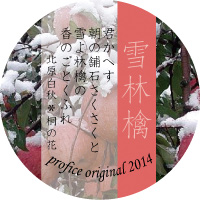藤原顕輔が詠んだこの和歌は新古今集のものですが、百人一首にも収められているのでご存知の方も多いと思います。雲間から漏れてくる月光はなんと清々しいことか、とその月明かりを詠んだわけですが、涼しくなり始めた秋の空。深夜ではなく夕刻から夜な感じですよね。太陽の光は黄色のイメージなのですが、月明かりは乳白色からクリーム色のイメージなのです。ですから、乳白色のフランキンセンスをキラキラとアルデヒドで輝かせ、そこに貴重なハニーサックルアブソリュートやフローラルノートを重ね、全体的にフレッシュでいながらフランキンセンスがしっかり香る、という香りにまとめました。こちらも香光同様に天然香料100%でありませんが、大量のフランキンセンスを使用しています。ハニーサクルアブソリュートはネロリとジャスミンを足したような美しい香りで、それをジュエリーのように中に隠しました。作った者だけがその存在に気づいて笑を浮かべる、そんな隠し味として。(2013年の開催は、入手が難しい香料を置き換えた、リフォーミュラレシピでの開催となります)