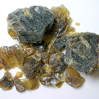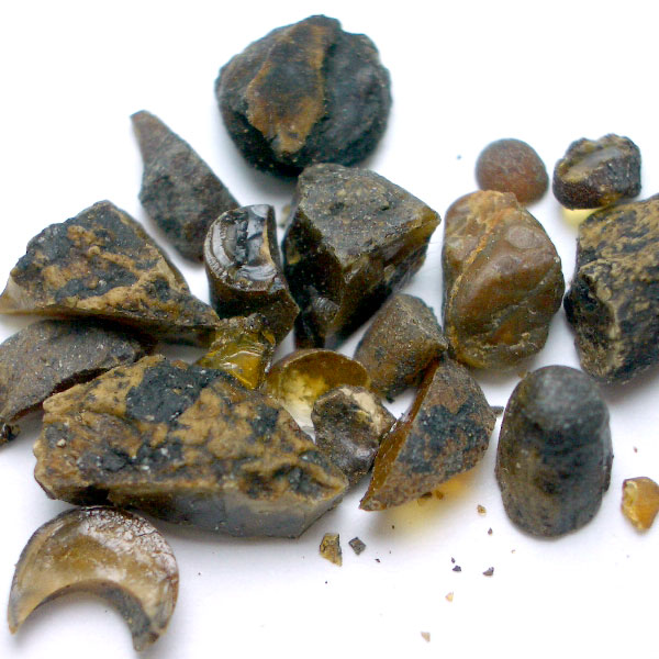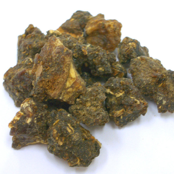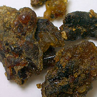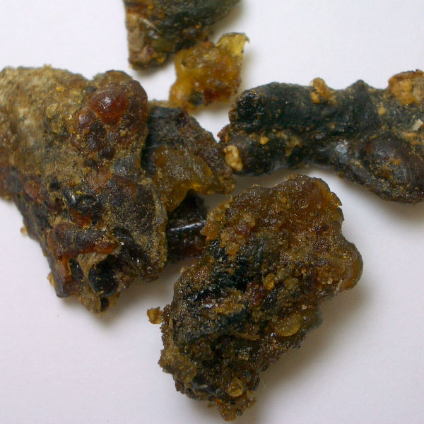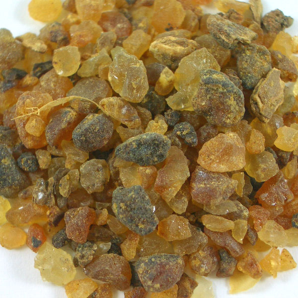 フランキンセンス同様に、等級というか質があるようで、樹皮上から摘み取ったものが1級品(画像参照)、地面に落ちて砂などを巻き込んだものが2級品となるようです。桜の樹から採取されたもので、焚くとミルラの香りがするものをミルラとして販売しているのもあるそうですが、それが3級品だそうです。東洋や中東では、このミルラを粉砕して抹香や線香に練って入れて使用しています。