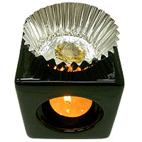 香炉で炊くとスモークが強くなってしまいます。炭を使うのだからしょうがないんですけど。そこで、アロマ用の製品を100円均一で購入してきました。100円均一のもので、上に器を置くタイプだったのですが、その器の代わりに、直接お弁当用のアルミを乗せます。そして、下から無香料のキャンドルを付けるわけですよ。すると、純粋に香りがわかるようになります。